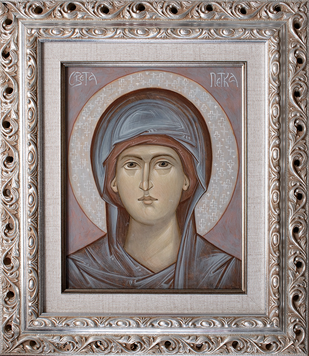 Света Петка је у Србији, после лика Пресвете Богородице, један од најчешће рађених женских ликова. Видимо много начина на који се њен лик описује код нас. На овој икони иконописац бира да сачува овалне црте које карактеришу нежно женско лице, и продоран и дубок поглед насупрот тој мекоћи образа и браде. Колорит је светао и мек, коришћено је широко осветљење лика, уз поједине графичке потезе, ликовно градећи динамичан однос површине и линије.