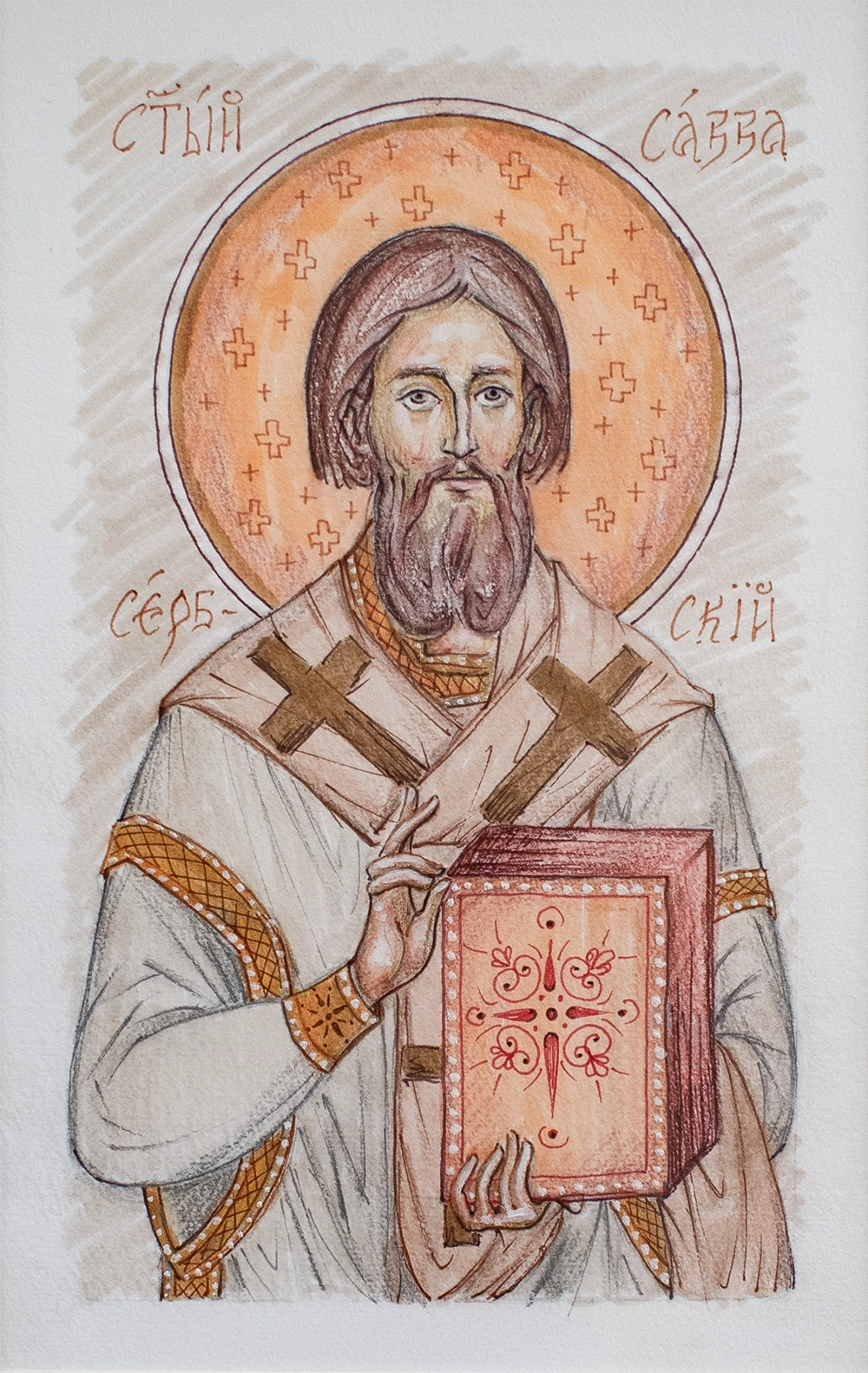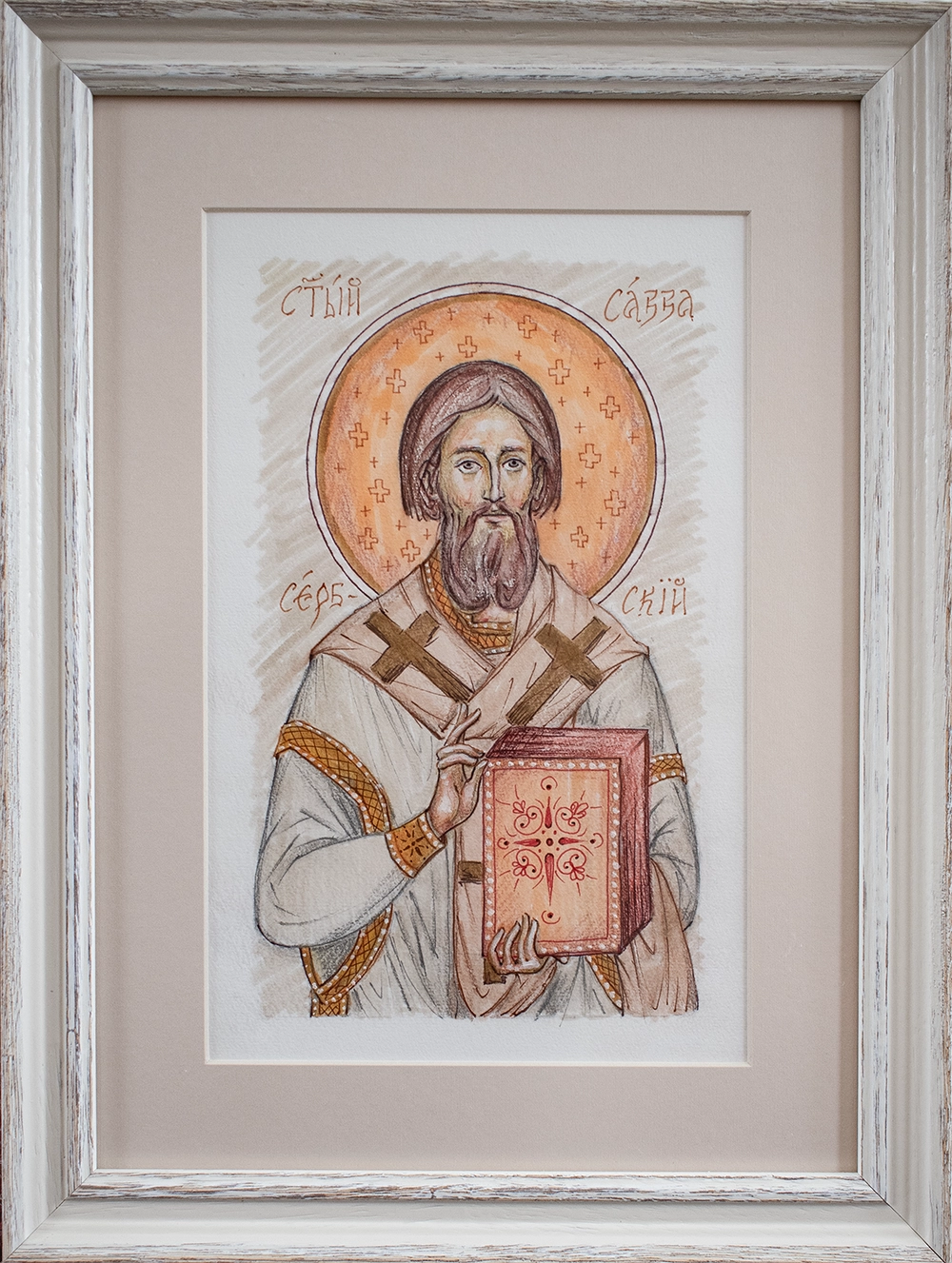 Приказ лика Светог Саве је урађен лаганим и брзим потезима, искоришћена је груба текстура папира која нам приликом посматрања даје осећај физичког контакта са иконом. Лик Светитеља задржава поглед на посматрачу чиме је опет наглашен елемент контакта. Одежда, благослов и Јеванђеље које држи у руци нам говоре о његовој архиепископској служби и очинској бризи за вернике. Његова молитва за вернике је активна и данас, јер је благослов упућен савременом посматрачу, чиме се прекида баријера историје и садашњости, и наглашава димензија вечности. Ореол увек представља благословену светост личности, у простору вечности, а крстићи који су у овој илустрацији уткани у ореол само потврђују и наглашавају тај елемент иконе, додају на вибрантност површине и акцентују светост личности која је, у овом случају, Свети Сава.